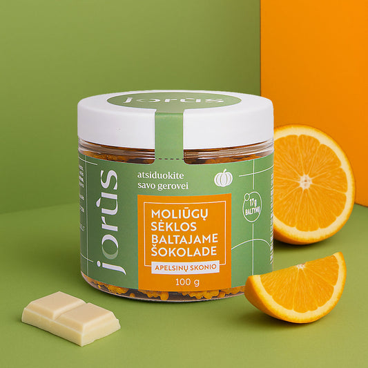 Apelsinų skonio moliūgų sėklos baltajame šokolade