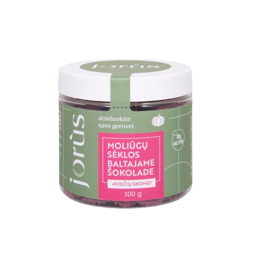 Aviečių skonio moliūgų sėklos baltajame šokolade