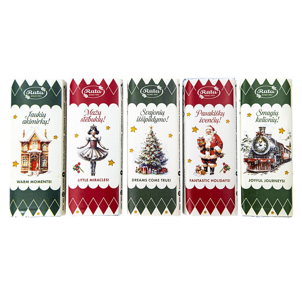 Tai juodojo šokolado plytelės, dvelkiančios žiemos pasakų nuotaika. Kiekvieną šokolado plytelę puošia 5 skirtingų dizainų, retro stiliaus etiketės su klasikinėmis žiemos iliustracijomis, kuriose susipina pasakiškos žiemos istorijos, šventiniai stebuklai ir vaikystės prisiminimai. Pakuotes taip pat puošia šilti palinkėjimai, kviečiantys stabtelėti ir pasimėgauti mažais šventės stebuklais: „Jaukių akimirkų!“, „Mažų stebuklų!“, „Svajonių išsipildymo!“, „Pasakiškų švenčių!“, „Smagių kelionių!“. Šokolade kakavos sausųjų medžiagų – 50 %, daug skaidulinių medžiagų.