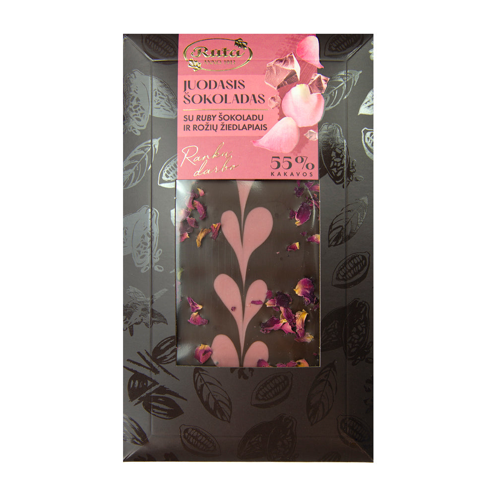 Rankų darbo juodasis šokoladas, papuoštas Ruby šokoladu ir rožių žiedlapiais – itin elegantiškas ir subalansuotas derinys, tinkamas mėgstantiems gurmaniškus potyrius. Vaisių rūgštumo, kakavos sodrumo ir gėlių švelnumo harmonija sukuria unikalią skonio kelionę ir sužavi subtiliu aromatu. Juodajame šokolade kakavos sausųjų medžiagų – 55 %. Ruby šokolade kakavos sausųjų medžiagų – 41,8 %.
