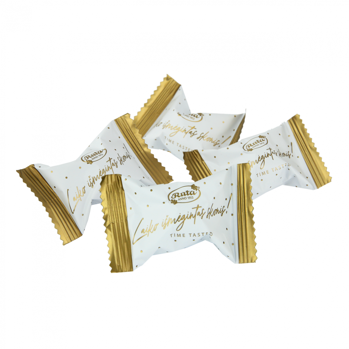 Juodojo šokolado saldainiai su šampaniniu įdaru „Rūta 1913“ – ryškus ir išraiškingas skonių derinys! Prabangus šampaninis įdaras tobulai dera su sodriu, aukštos kokybės juoduoju, ne mažiau kaip 55 % kakavos sausųjų medžiagų turinčiu šokoladu ir sukuria nepakartojamą skonių harmoniją. Saldainiai pateikiami baltos spalvos pakuotėje su aukso detalėmis ir saldainių fabriko „Rūta“ šūkiu – „Laiko išmėgintas skonis!“