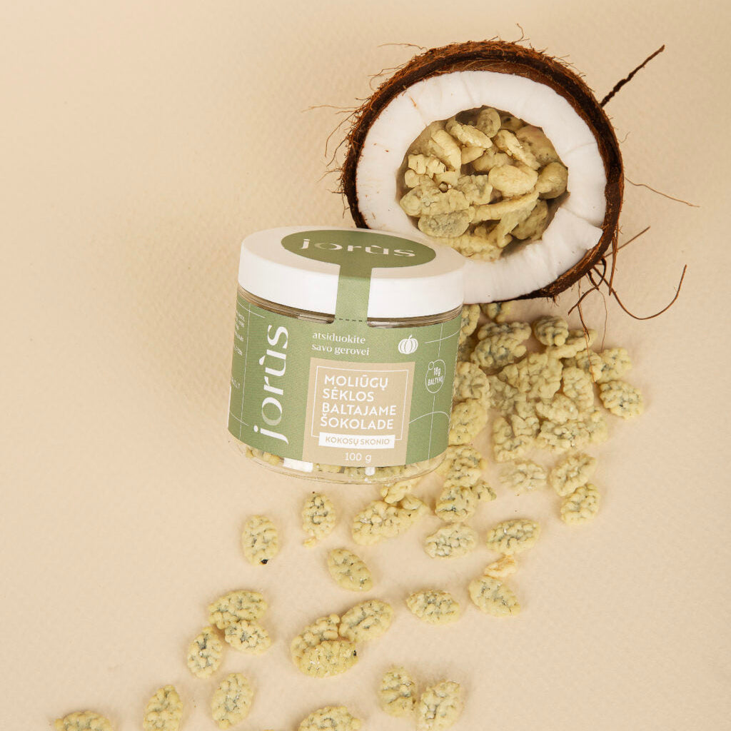 Gardus ir traškus užkandis – kokosų skonio moliūgų sėklos baltajame šokolade. Tobulas užkandis, kai norisi šio to saldaus – moliūgų sėklos šokolade! Puikus pasirinkimas visoms kelionėms, ramiam vakarui su įtraukiančiu filmu ar pasidalinti su kolegomis biure.
