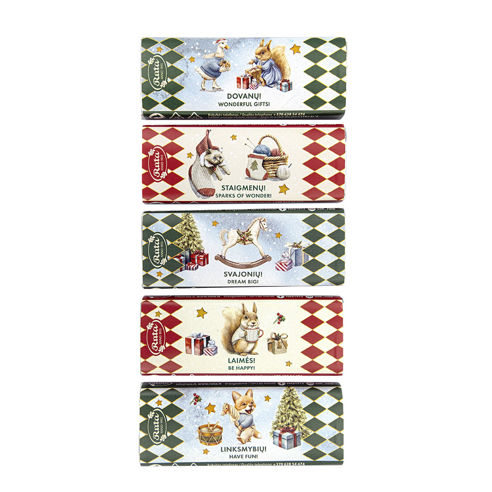 Tai pieninio šokolado plytelės su 5 skirtingų dizainų, retro stiliaus etiketėmis. Jas puošia žiemos švenčių akcentai ir jaukūs personažai ir šilti palinkėjimai: „Dovanų!“, „Staigmenų!“, „Svajonių!“, „Laimės!“, Linksmybių!“. Šokolade kakavos sausųjų medžiagų – 32 %.