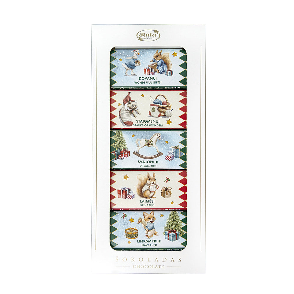 Tai 5 pieninio šokolado plytelės, pateikiamos elegantiškoje dėžutėje su langeliu. Šokolade kakavos sausųjų medžiagų – 32 %.