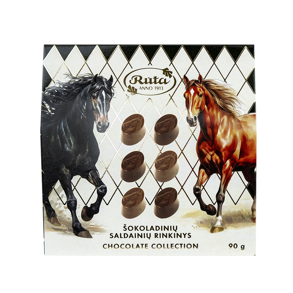 Dailioje dėžutėje rasite dviejų rūšių saldainius: pieninio šokolado su pistacijų įdaru ir juodojo šokolado su anakardžių bei kavos įdaru. Kiekvieną saldainį puošia arklio atvaizdas. Puiki dovana pasitikti Arklio metus!