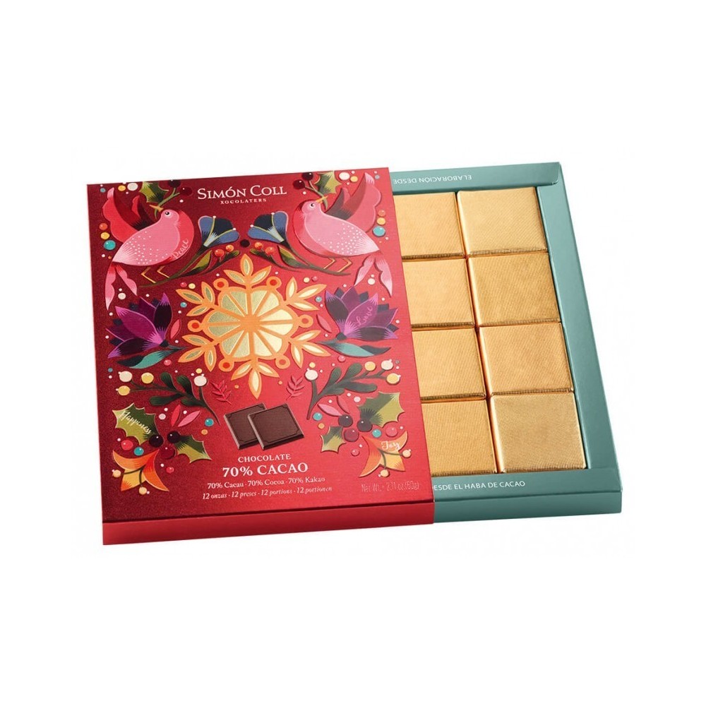 Juodojo 70 % šokolado plytelės puošnioje, kalėdinėje dėžutėje. Idealus pasirinkimas dovanoms, šventiniam pasisėdėjimui ar paprasčiausiai ramiai popietei kaip desertas prie kavos puodelio.